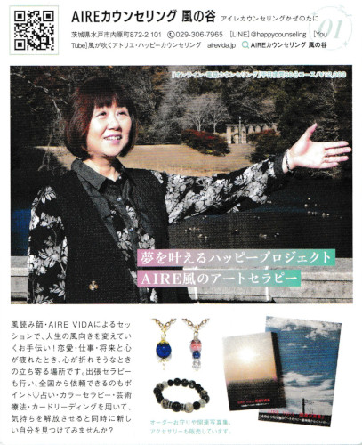 自分を開放するためのセラピー・AIRE風のアートセラピー 人生を豊かにするアイディア「自然体で生きる7つのヒント」 人生を安心に過ごすアイディア「未来への準備 生前準備10か条」 大人のコミュニケーション術「人間交流塾」 シニアほほえみカウンセリング 出張セミナー・出前メニュー 開運アクセサリー 野うさぎの足 セミナー実績・メディア アクセス AIRE VIDA 夢を叶えるプロジェクト おひとりさま倶楽部(終活研究会) 共催定期セミナー 多世代型サロン「ハート♡プリーズ」 ペットロスアートセラピストのご案内
